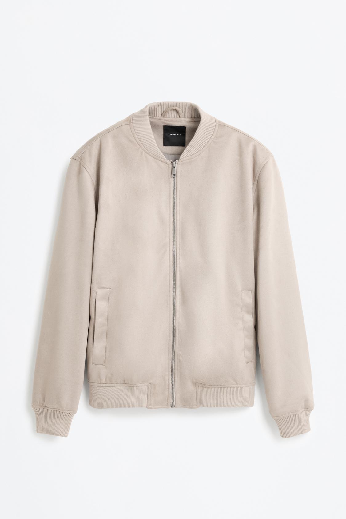 Chaqueta bomber con cierre de cremallera y puños y bajo de canalé. Tejido liso efecto ante, ideal para primavera u otoño.