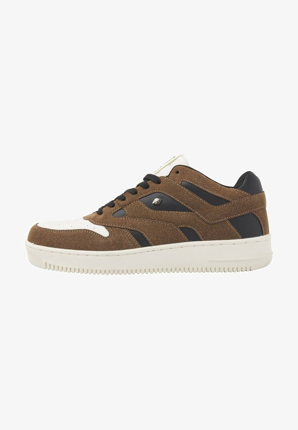 Zapatillas de estilo urbano con combinación de materiales que parecen ser ante y cuero sintético, suela blanca gruesa, diseño moderno y versátil para uso diario.