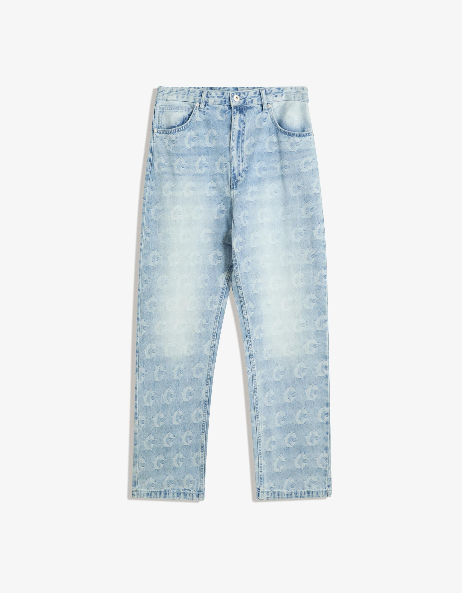 Tejido denim con estampado repetitivo de símbolo, estilo casual y moderno.
