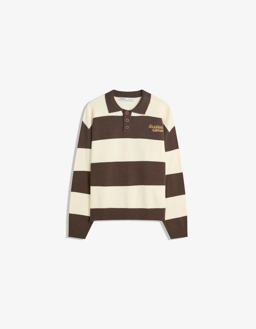 Jersey de punto grueso con cuello tipo polo y rayas en las mangas, estilo deportivo y urbano.